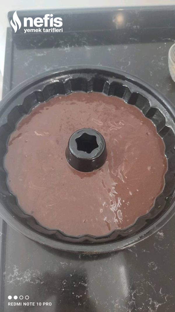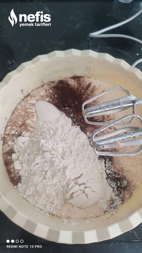 4. Daha sonra kıvamı olduğunu anladığımız vakit kabartma tozunu unun üzerine döküp, çırpalım ve yağlanmış kek kalıbına dökelim.