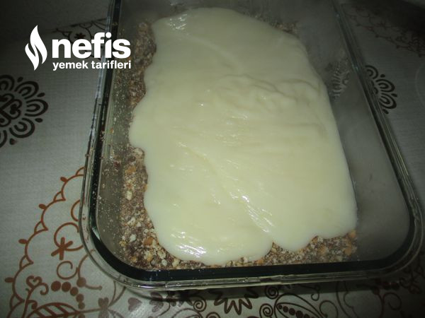 - Servis kabını sudan geçirelim kremanın yarısını dökelim, sonra güzelce ezdiğimiz bisküvileri üzerine serelim, kalan kremayıda gezdirerek dökelim, düzeltelim buzdolabına koyalım.