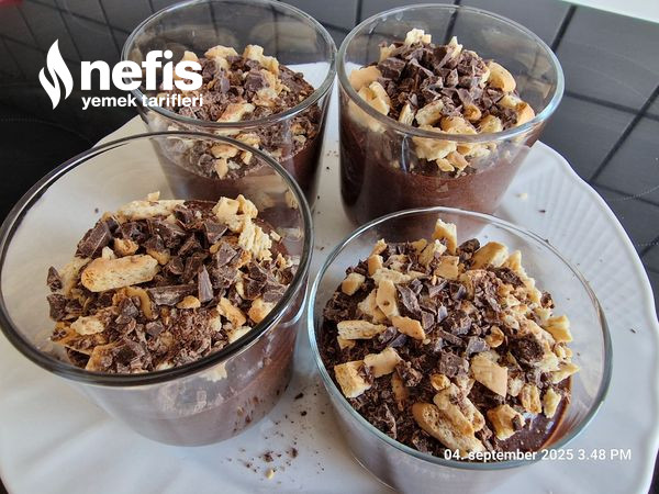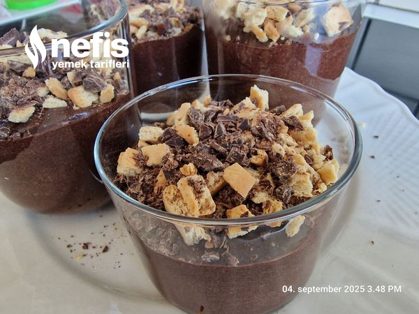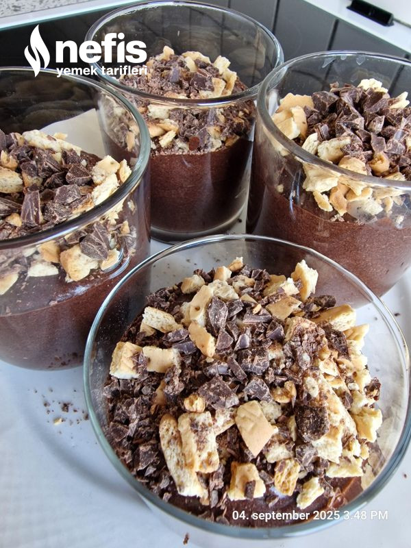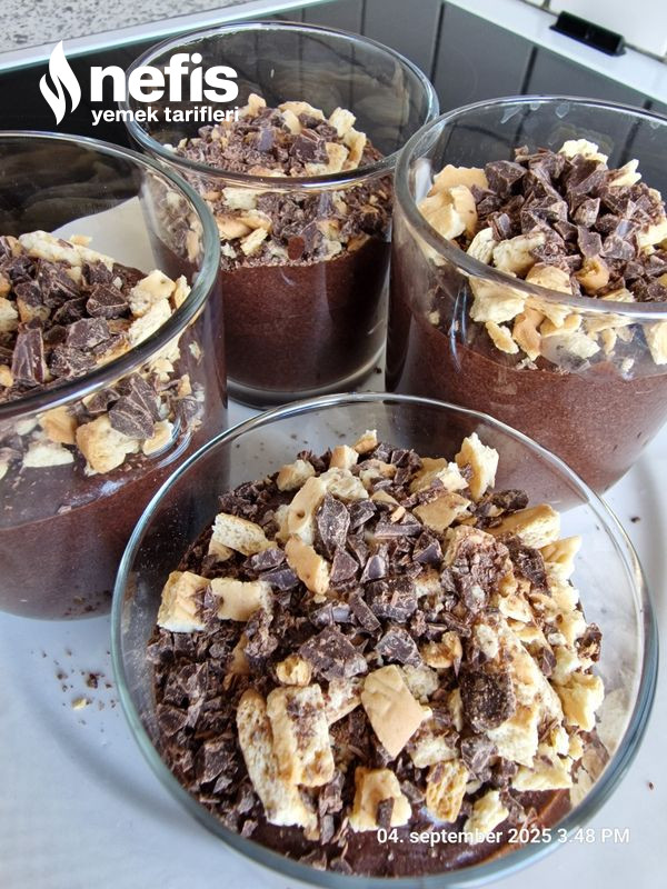 - Hazır olan pudinglerin üzerine küçük modüller halinde kesilmiş çikolata ve bisküviler serpilir.