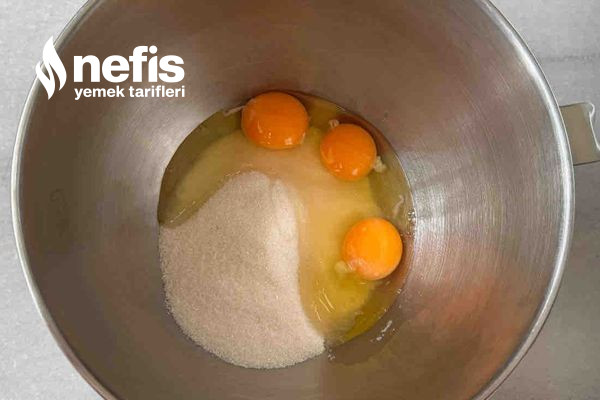 - Yumurtaları ve şekeri bir kaba alıp mikser ile köpük köpük olana kadar çırpalım.