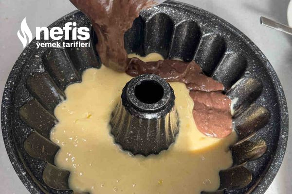 - Kakaolu olmayan karışımın yarısını kek kalıbına dökelim, üzerine kakaolu olan karışımı dökelim.