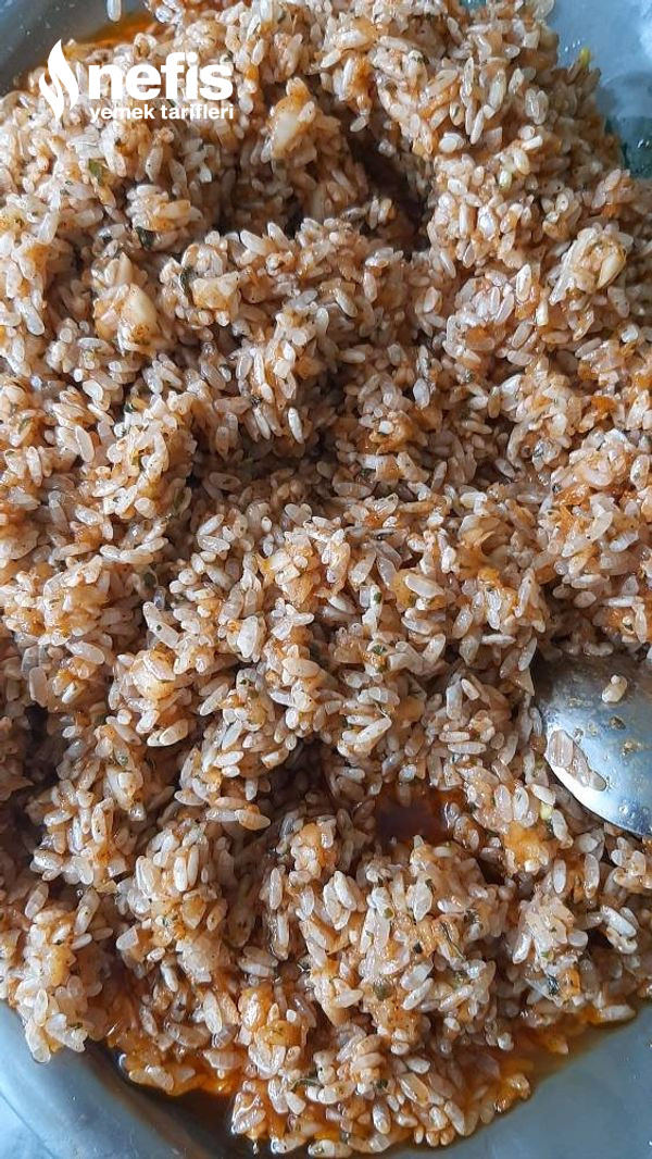 - Pirinç ve bulgur yıkanır soğanlar küçük küçük doğranır. Tüm materyal güzelce karıştırılır. (ben içini çiğ olarak yapıyorum isteyen iç materyalini biraz pişirebilir).