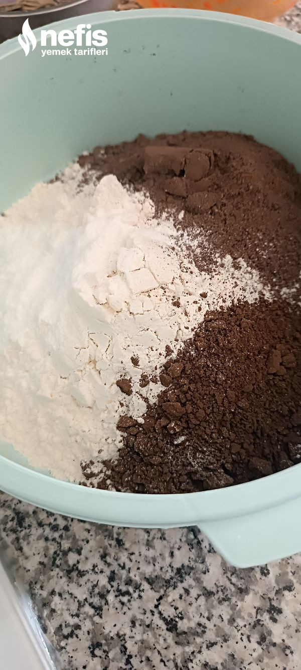 - Geniş bir kaseye un, kakao, kabartma tozu, ve çikolata sosunu koyup karıştıralım.
