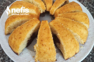 4. Önceden margarinle yağlanmış kalıbımıza sade kısmı döküyoruz.