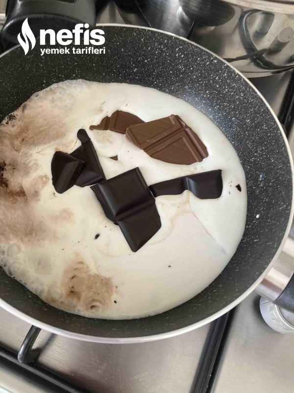 - Ganajı için krema ve çikolataları ocağa alıp bir tık kaynayana kadar karıştırıp eritiyoruz.