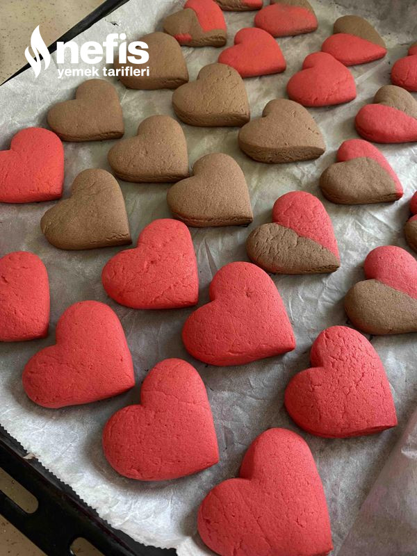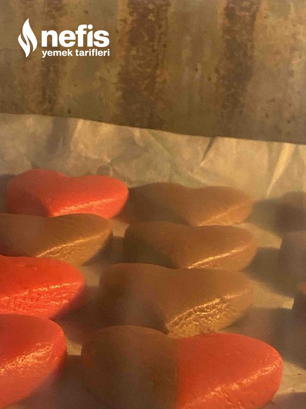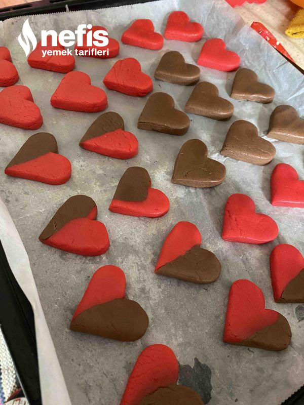 - Kalpli kalıp kullanıyorun ben. Kalbin bir yarısını pembe, öbür yarısını kakaolu olmasını istediğim için kalpli hamurları 2’ye bölüp kalp formunu birleştirip tekrar oluşturuyorum.