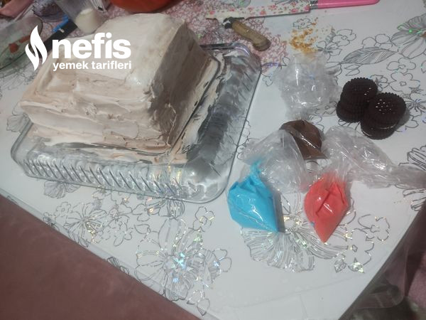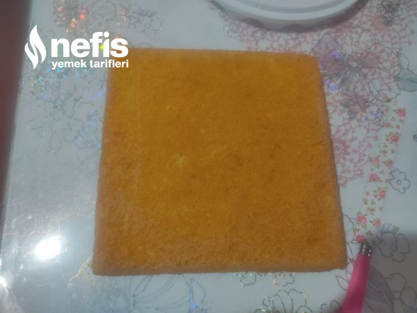 8. Daha sonra görselde gördüğünüz üzere. Hayal gücünüzü nazaran süsleme yapın. Keki krema sürmeden evvel sütle ıslatın.
