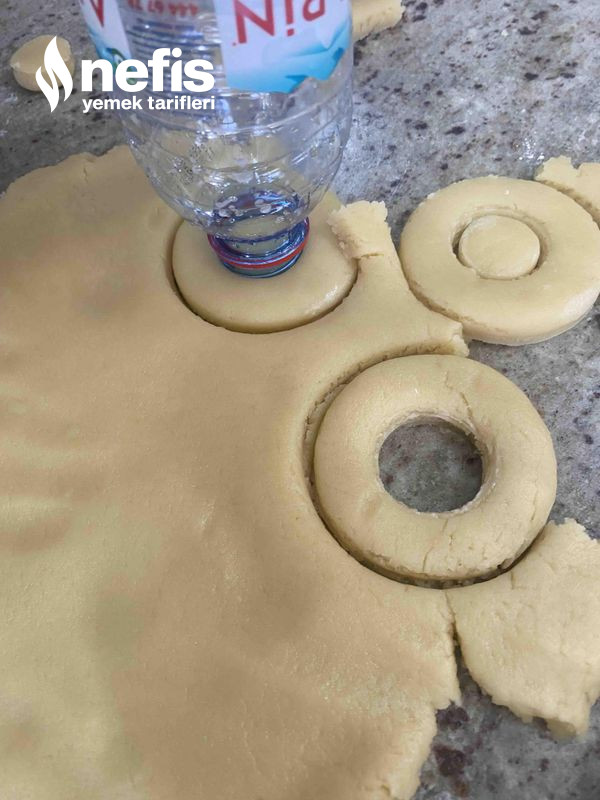 3. Şekillendirmek için su bardağı ve su şişesi kullandım ben,simit formu verilerek evvel yumurta beyazına sonra susama bulanarak yağlı kâğıt serili tepsiye alınır.