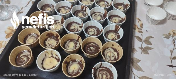 - Kaplara 1 buçuk yemek kaşığı olacak halde kakaolu ve 1 kaşık da sade kekden ilave ederek kaplara doldurun.