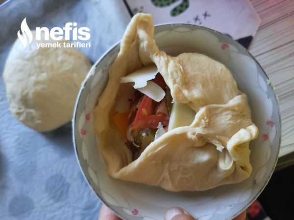 7. İçine kızarttığımız köfteyi ve eklemek istediğimiz öteki materyalleri de ekleyerek hamuru kapayalım.