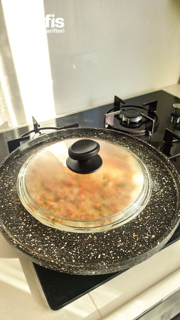 5. Açık formda yapılacaksa beze yuvarlak açılır. Üzerine kıyması serilir. Tavaya alınır ve üzerine kapak kapatilir. Kıymalı harç pişip hamurun altı kızarana kadar pişirilir. Afiyet şifa olsun ❣️