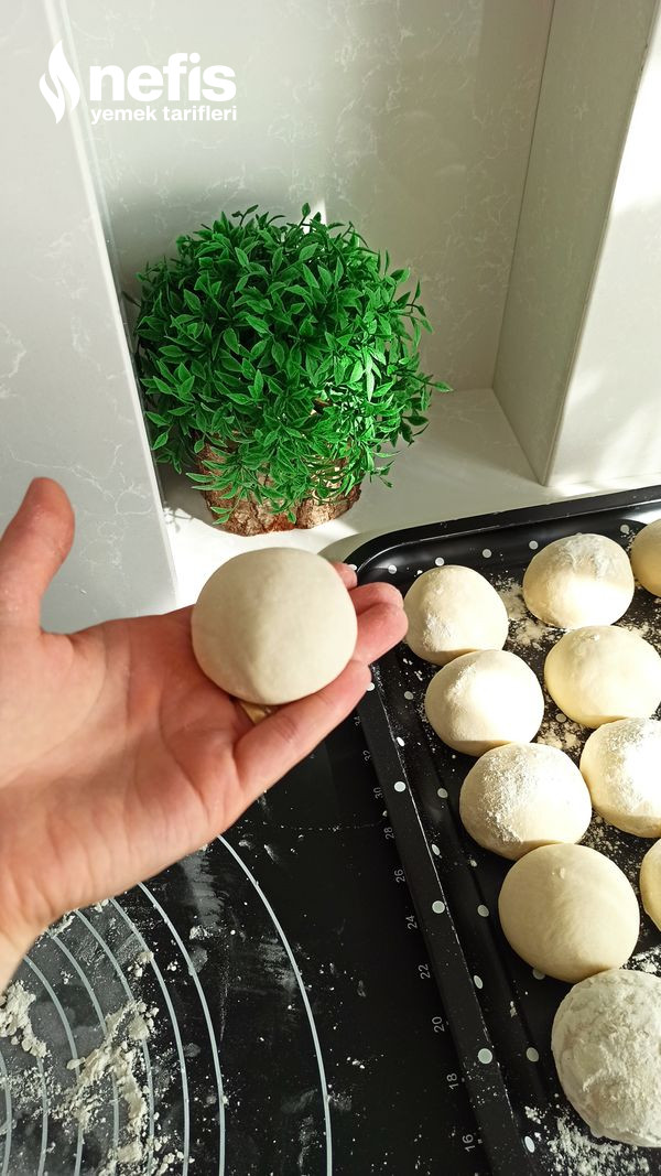 3. Dinlenen hamur bezelere ayrılır. Açılır. Kapalı olarak yapılacaksa yarısına kıymalı harç konulur. Kenarları bastırarak kapatılır.