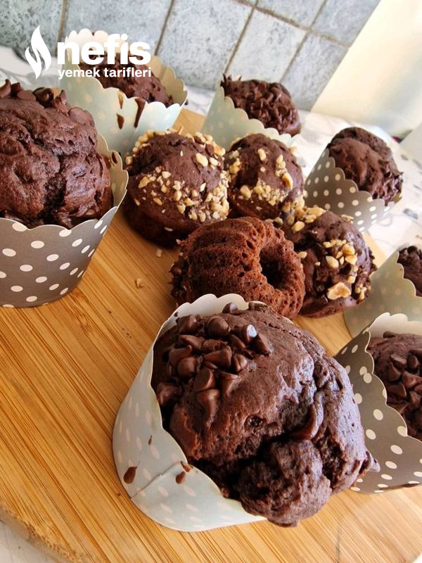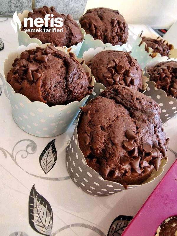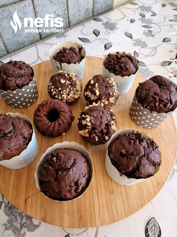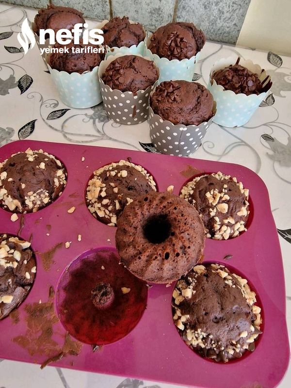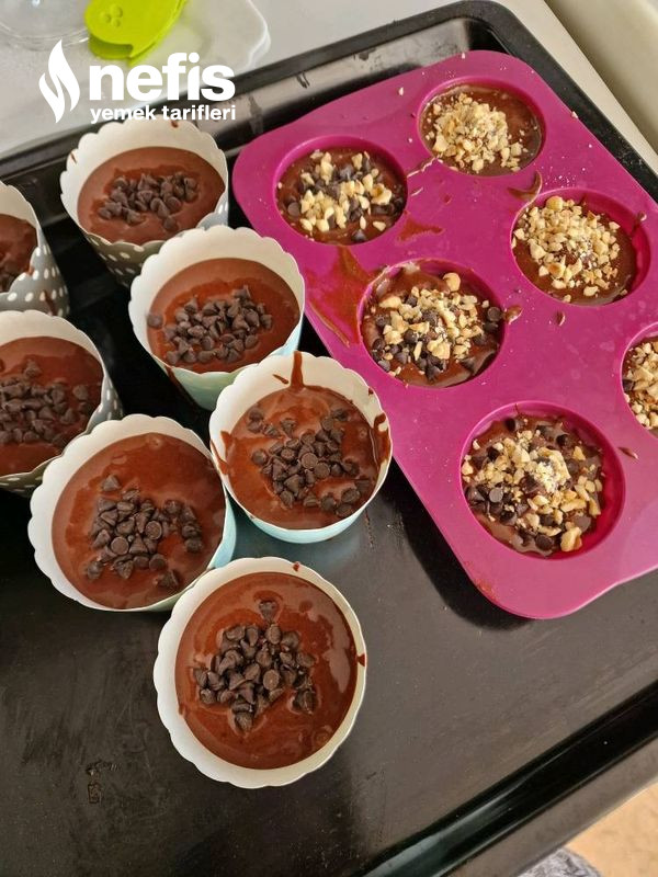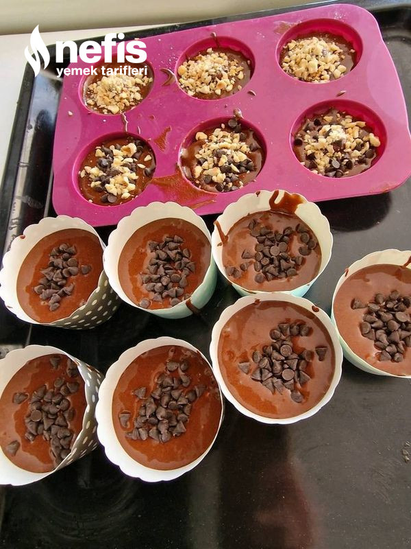 5. Tüm hamuru paylaştırdıktan sonra kapkeklerimizin üzerine damla çikolata serpelim.