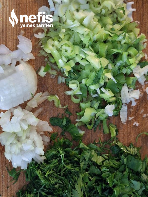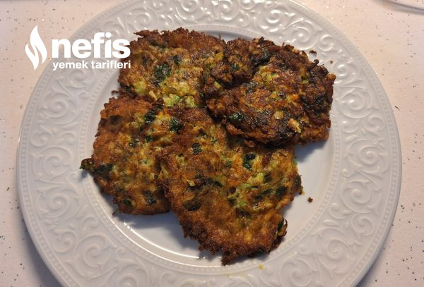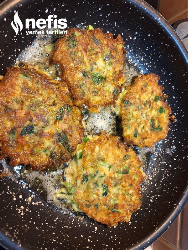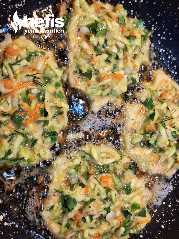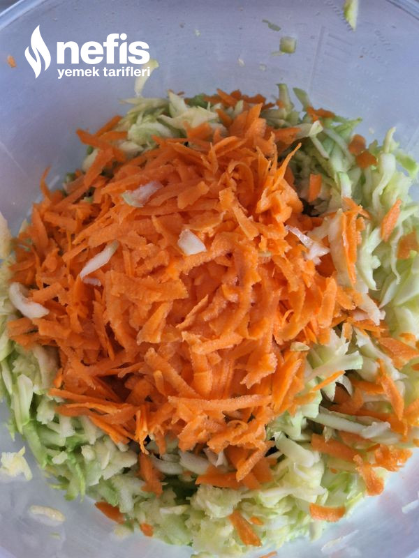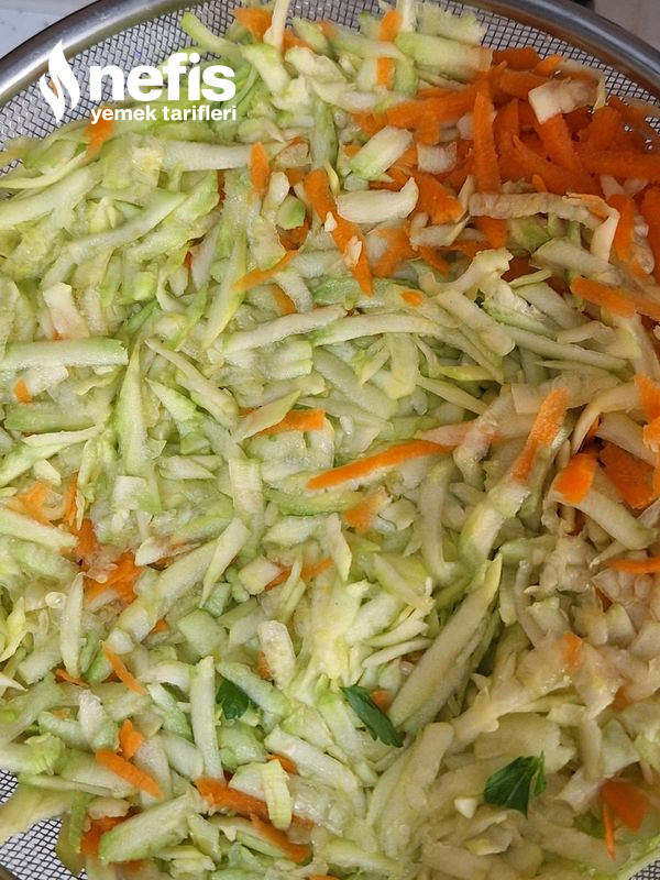 - Kabak ve havuç yıkanıp, soyulur ve rende ile büyük ebatta rendelenir. Maydanoz, dereotu ve soğanlar ve sarımsak çok ince doğranır. Kabak ve havuç, suyu süzülmesi için süzgeçte bekletilebilir.