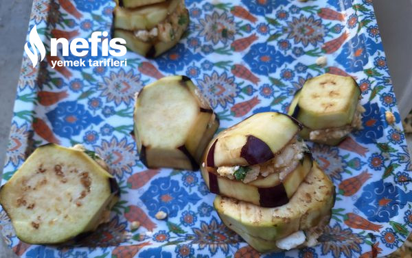 - Patlıcanları soyalım ve 2 parmak kalınlığında keselim. Ortasına peynirli içimizi koyacak biçimde ortasını açalım.