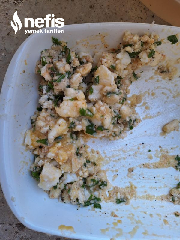 - Peynir maydanoz ve dereotunu çatal ile ezerek iç materyali olarak hazırlayalım. Çok az zeytinyağı ekleyelim.