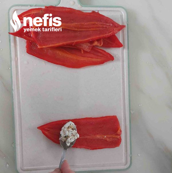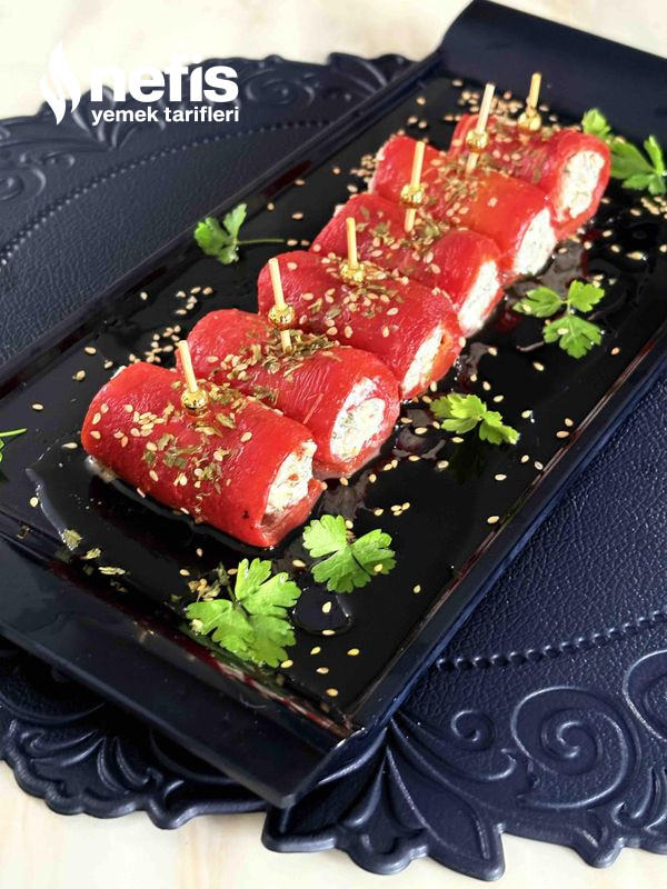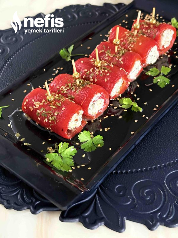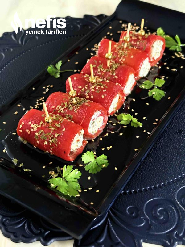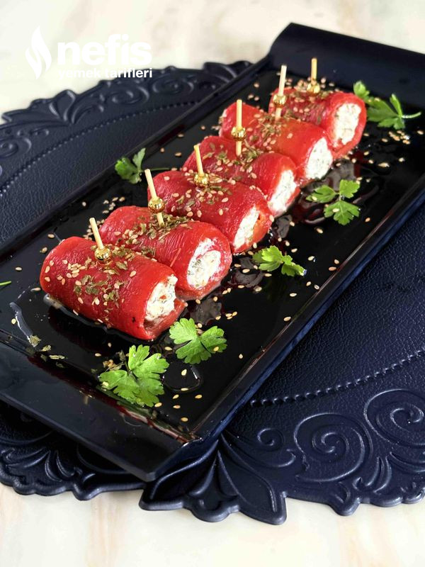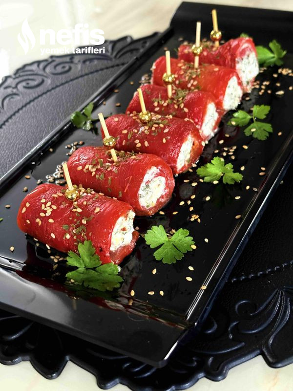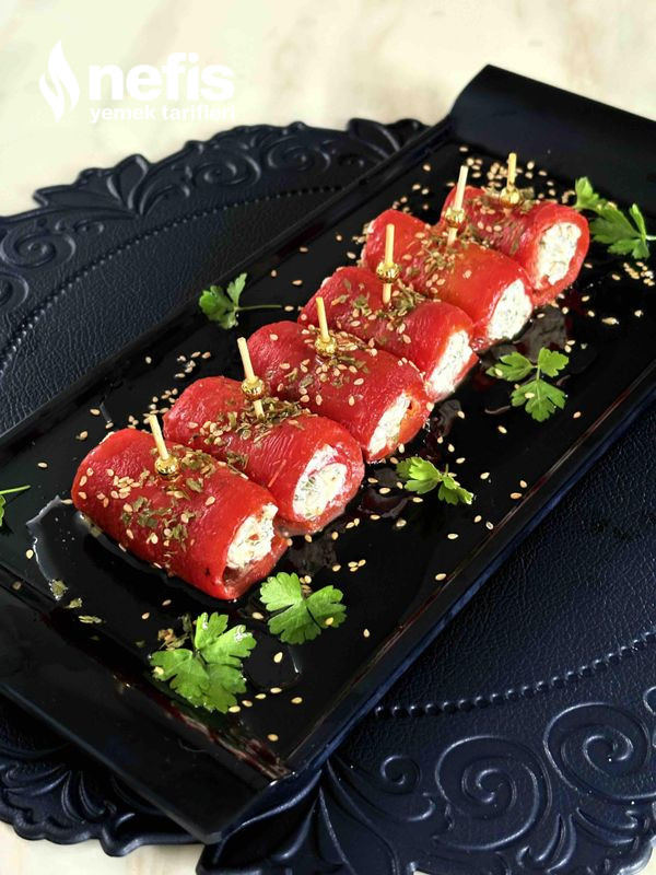 - Hazırlamış olduğunuz peynir karışımından biberlerin üç kısmına koyup sarınız hepsine birebir süreci yaptıktan sonra ben susam ,maydanoz ve zeytin yağı ile süsledim siz üzerlerin idilediğiniz üzere süsleyip servis yapınız.