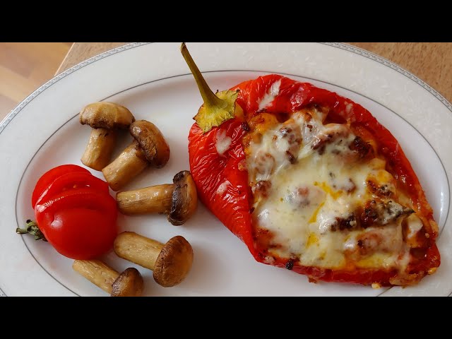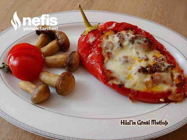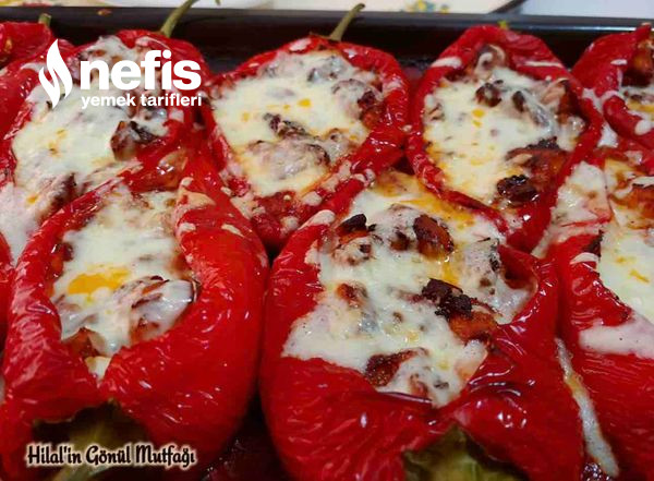 10. Önceden ısıtılmış fırında 180 derecede pişiriyoruz. (ben yarım saat pişirdim) fırından çıkmasına 5 dk kala kapya biberlerin üzerine kaşar peyniri ekleyip üzeri kızarana kadar pişiriyoruz.