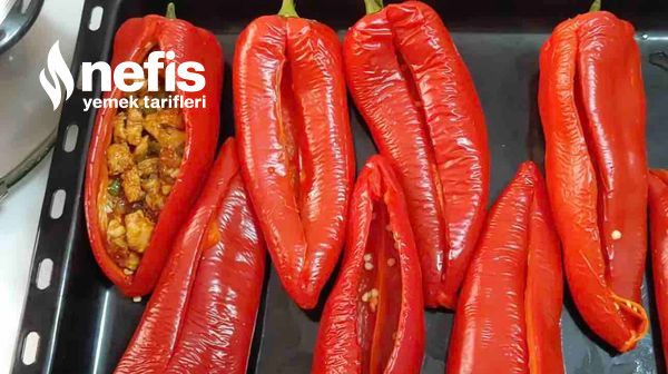 1. Kapya biberleri bir tepsiye yerleştirip uzunlamasına kesiyoruz( karnıyarık gibi).