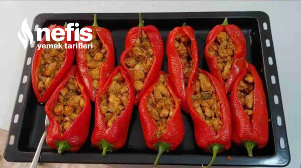 8. Pişen tavuk sotemizi, kapya biberlerin içerisine eşit bir formda dolduruyoruz.