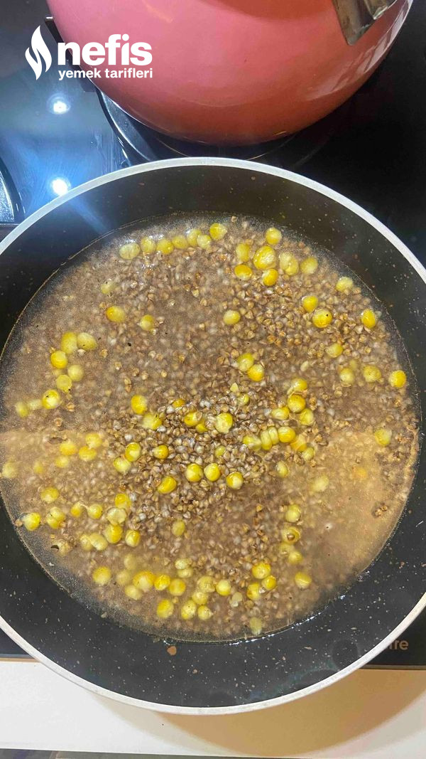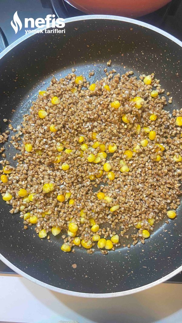 2. Üzerine ıslatılmış karabuğday eklenir.Hepsi kavrulur.