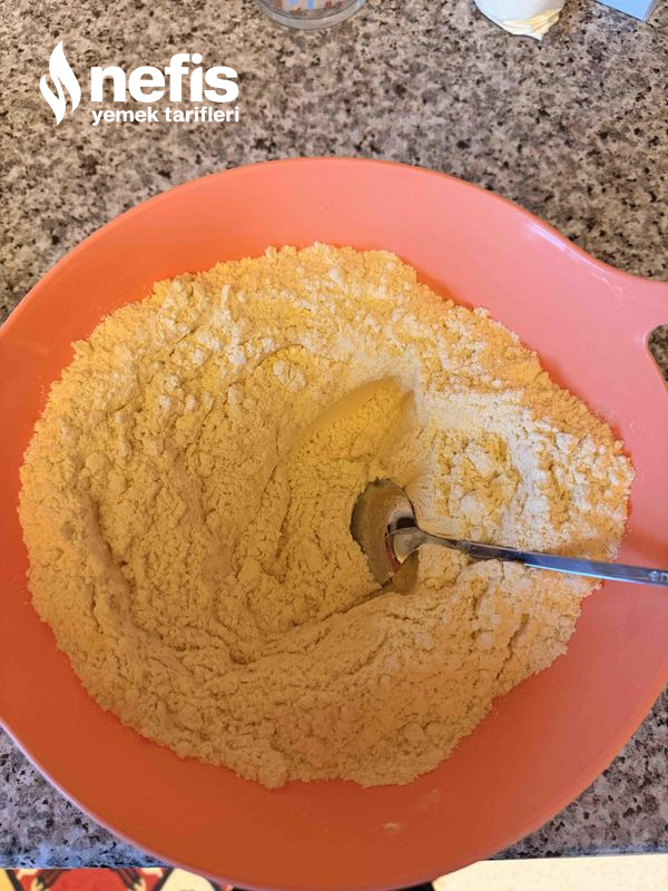 - Bir kapta mısır unu, unu, tuz ve şekeri karıştırın.