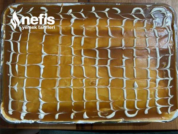 - Kremşantiyi sütle çırpın şerbetini çeken kekin üzerine sürün ve 1 kaşık krem şanti ayırın. Karamelide krem şantinin üzerine dikkatlice sürün, karamelin katiyen soğuk olması gerekiyor kalan 1 kaşık kremayıda çok az sütle karıştırın.