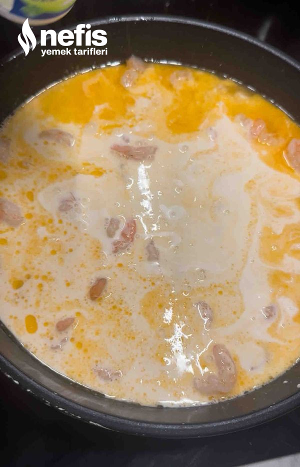 3. Üzerine 1 bardak sıcak su ve kremayı dökün, karıştırarak ısıtın.