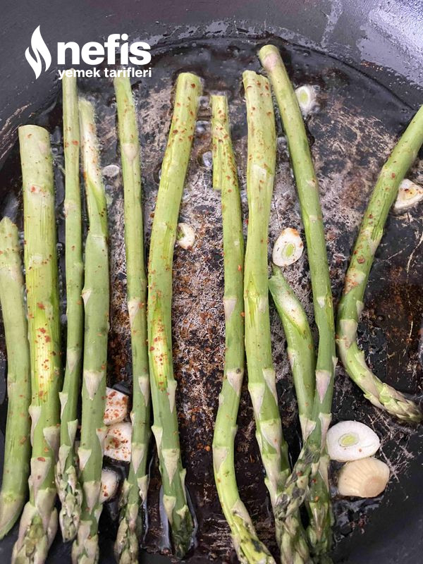 3. Tavaya zeytinyağı ve kuşkonmazları alın ,yumuşayana kadar ağızını kapatıp orta ateşte pişirin.