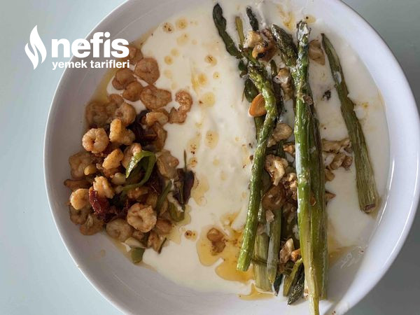 5. Sarımsaklı yoğurt üstüne evvel kuşkonmazları ve başka kenara da karidesleri koyun ve servis edin.