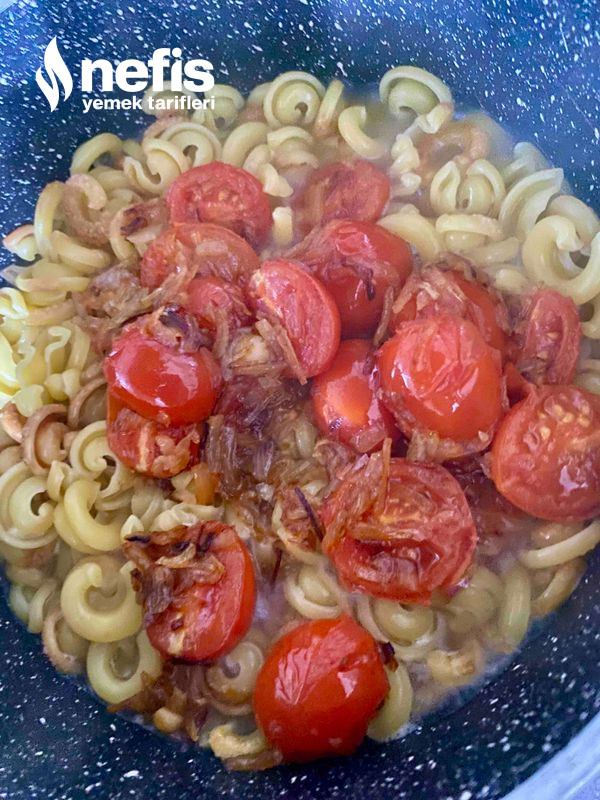 - Kavurduğumuz soğan ve domatesi makarnanın yanına alalım makarnayı piştiğinde kapağını yarım kapatıp, altını da kapatalım beklemeye alalım.