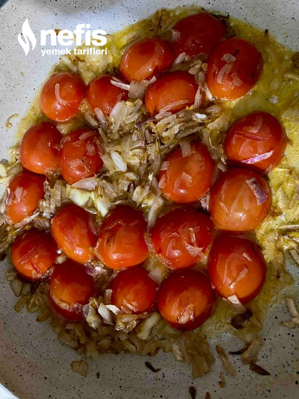 - Soğanları tuz ile kavuruyoruz domatesleri ikiye kesip, artlı önlü soğanlarla bir arada pişiriyoruz.