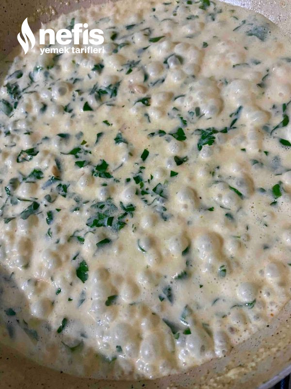 - Kremaya yarım su bardağı su ekleyelim maydanozları ince kıyıp ek edelim 3 – 4 dakika karıştıralım ve makarnaya sosu dökelim makarnamız hazır afiyet olsun.