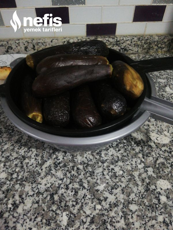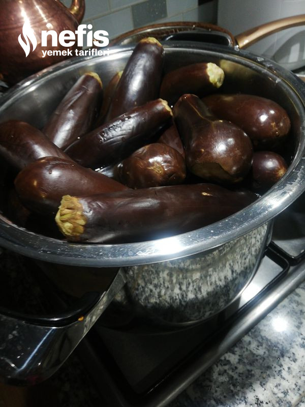 1. Patlıcanların sap kısımları temizlenip tuzlu suda rengi dönünceye kadar 10 dakika haşlanır.