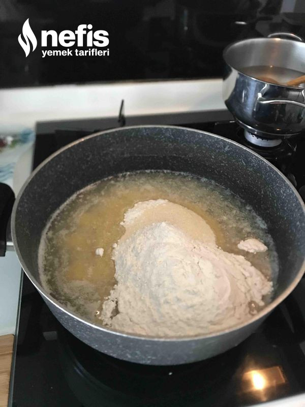 3. Diğer taraftan öteki bir tencereye yağlar konur ve eridiğinde üzerine irmik ve un ek edilip, evvel orta ateş sonra kısık ateşte 20 dakika rengi yoğunlaşana kadar kavrulur.