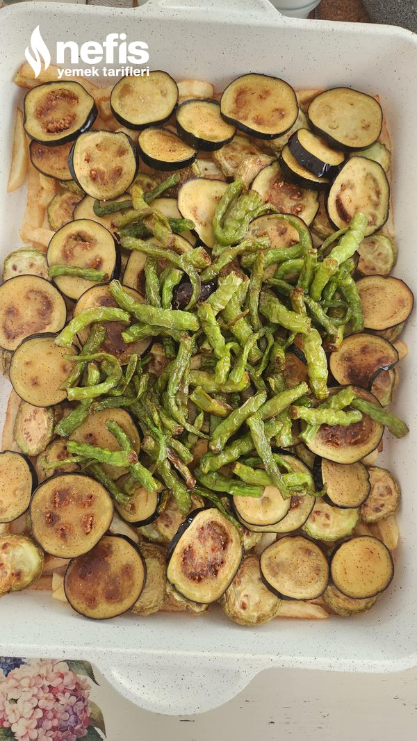 1. Sebzeleri düzgünce yıkadıktan sonra patateslerin kabuklarını soyun ve ince ince dilimleyin. Patlıcan ve kabakları yuvarlak ince dilimler halinde doğrayın. Biberleri parmak halinde dilimlere ayırın. Son olarak domatesleri rendeleyin.