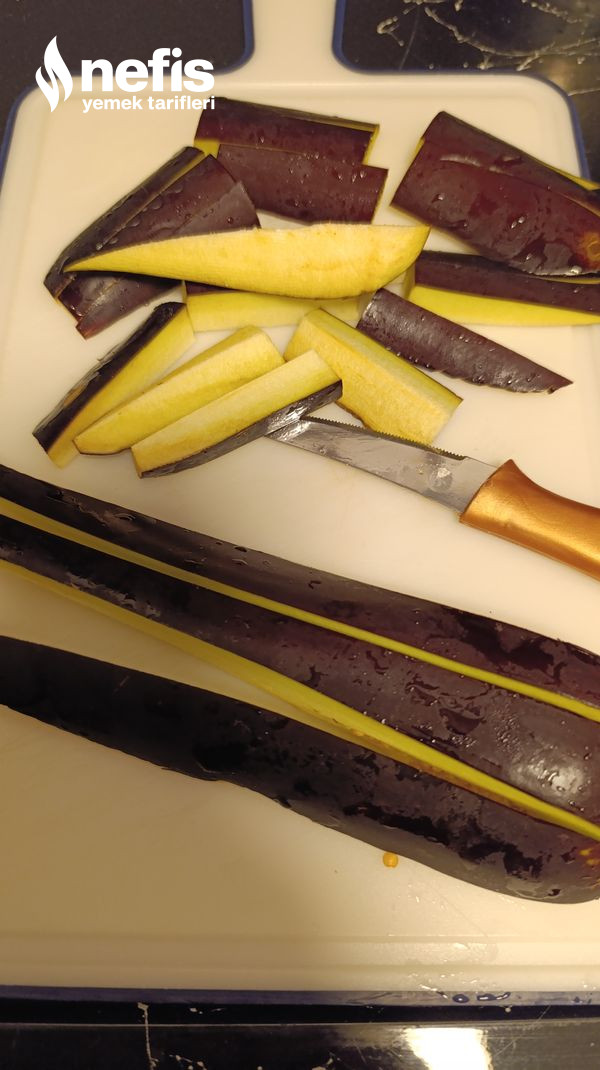 - Patlıcanları alacalı soyup uzun olarak kesiyoruz.