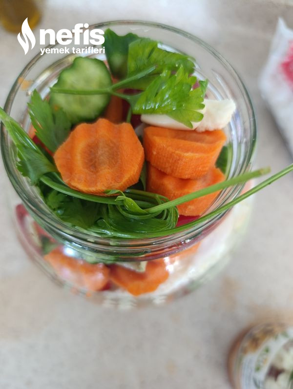 - Daha sonra dilimlediğimiz tüm zerzevatları kavanozumuza koyalım, maydanoz ,nohut, sarımsak, limon tuzu ve kaya tuzunu ekleyelim.
