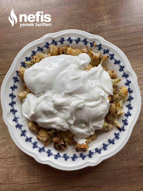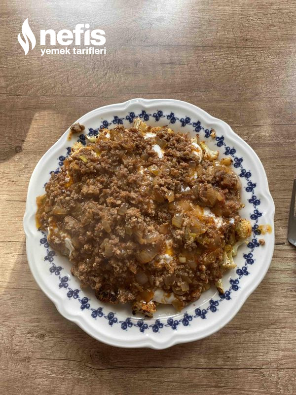 5. Fırınlanmış karnabaharların üzerine yoğurdumuzu döküp onun üzerine de kıyma sosumuzu döküyoruz. Afiyet olsun….
