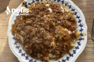 5. Fırınlanmış karnabaharların üzerine yoğurdumuzu döküp onun üzerine de kıyma sosumuzu döküyoruz. Afiyet olsun….
