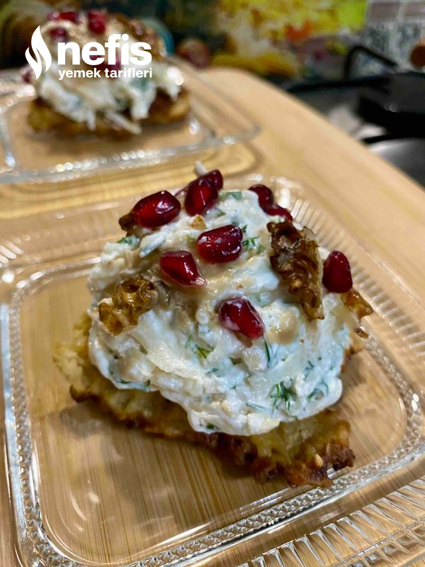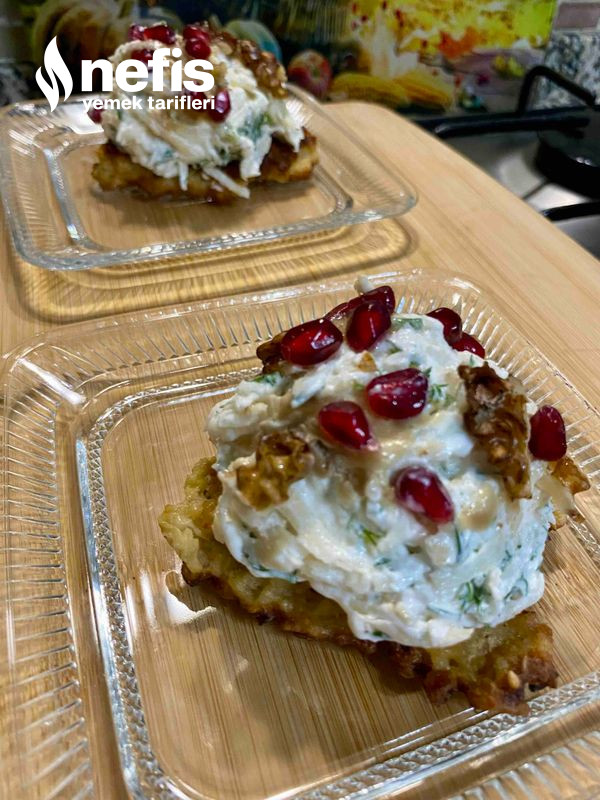 7. En son servis ederken karnabahar mücver üzerine bir kaşık kereviz salatası koyup nar ve tahin ile süsleyip sevris ediyoruz afiyet olsun.