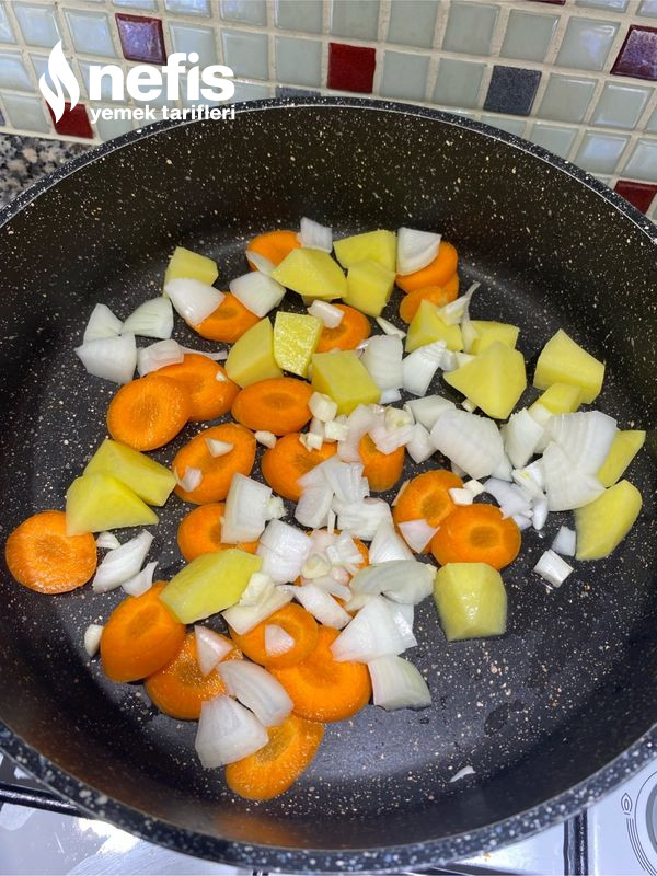 - Soğanı yemeklik doğruyoruz havucu halka halinde, patatesi küp küp, sarımsağıda doğradıktan sonra tencereye alıp yağı ek edip orta ateşten bir tık kısık ateşte sotelemeye başlıyoruz. Sonra salça ve domatesi ek edip, sotelemeye devam ediyoruz.