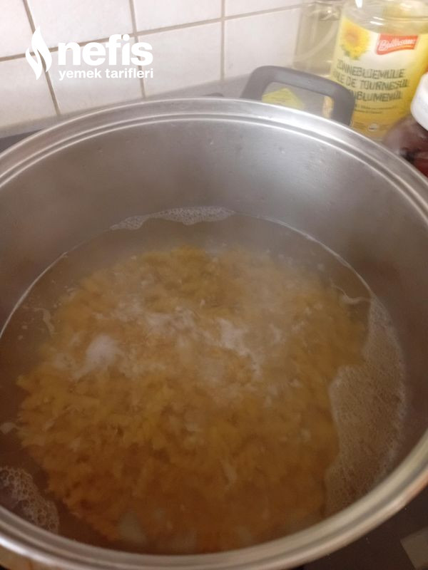 - Öncelikle makarnayı uygun tavaya alalım biraz tuz ve bir damla sıvı yağ ek edip haşlayalım.