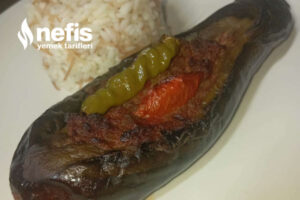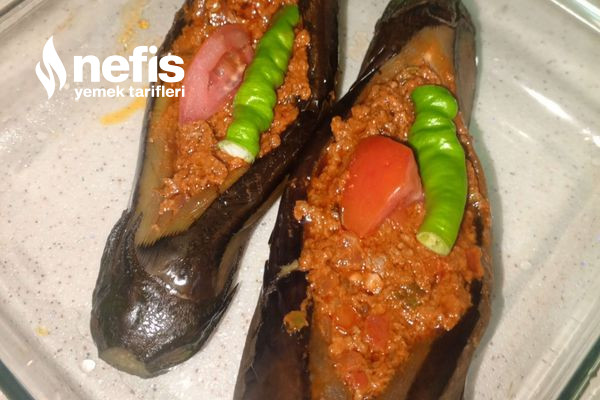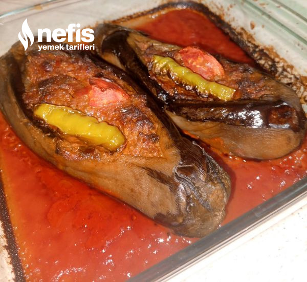 - Kızarmış patlıcanları borcama alın ve ortalarını açıp kıymalı harcı ve biber, domatesi koyun.