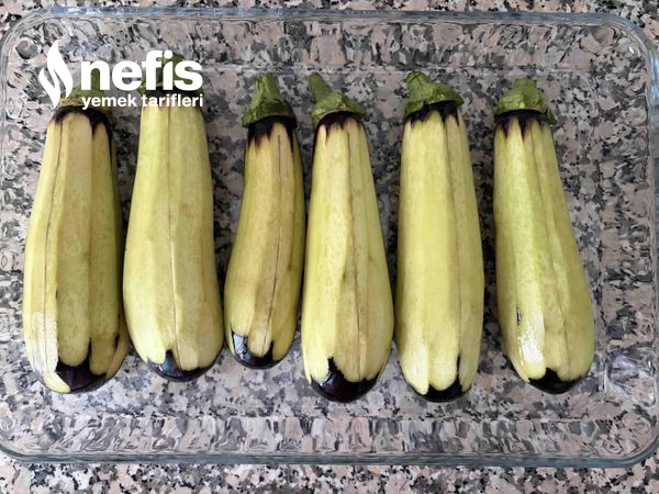 1. İlk olarak patlıcanları fotoğraftaki üzere alacalı soyalım.