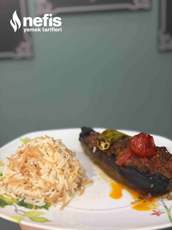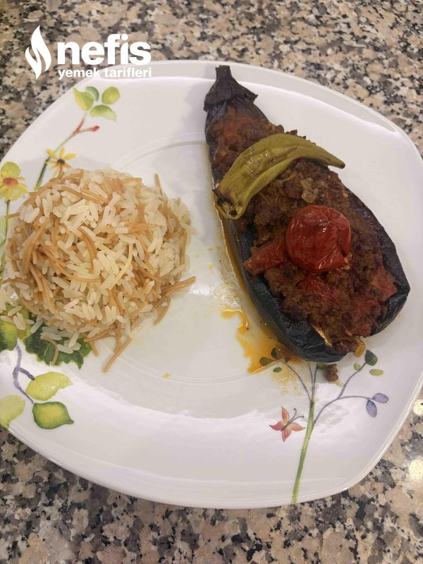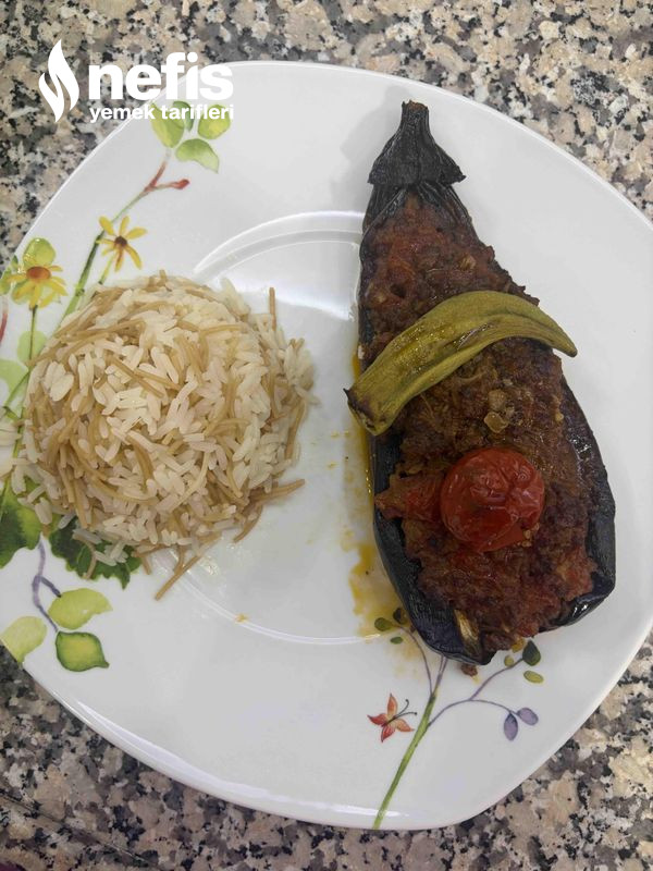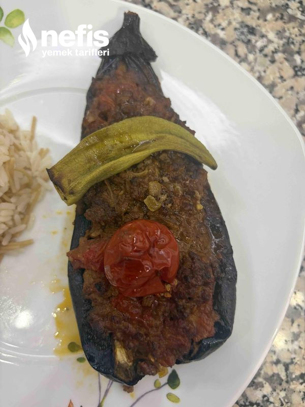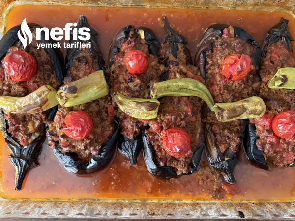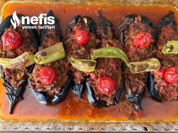11. Pişen kıymalı harcımızı közlenen patlıcanlarımızın içine dolduruyoruz, kalan suyu da ek ediyoruz.