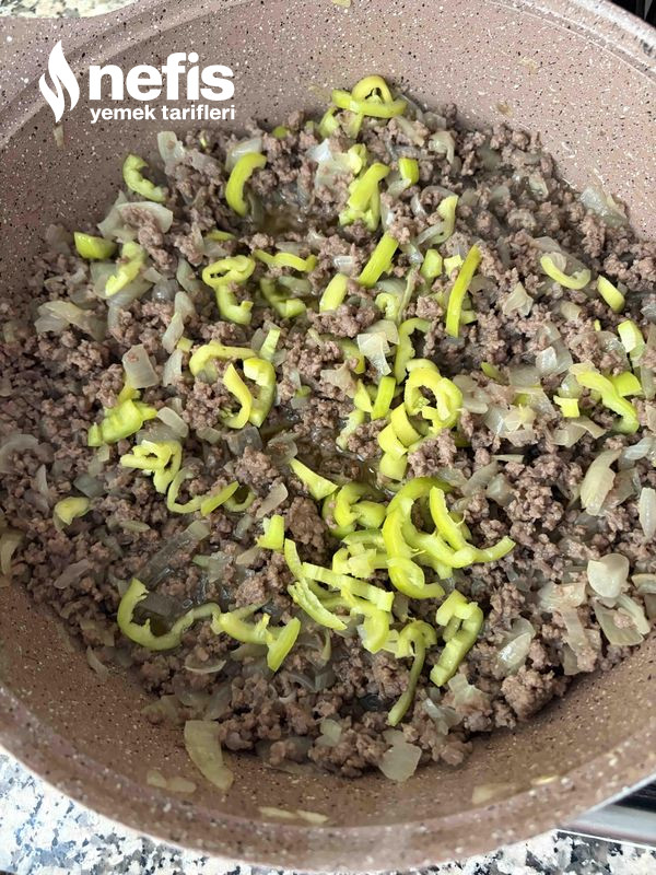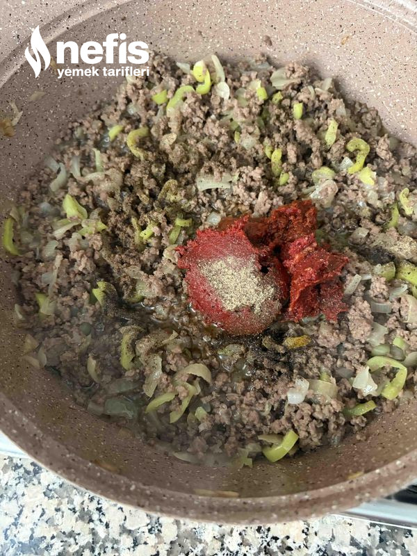 8. Kıyma kavrulurken yeşil biberleri ekliyoruz bir kaç tıp daha çevirdikten sonra salçayı da ekleyip kokusu çıkana kadar kavurmaya devam ediyoruz.