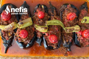11. Pişen kıymalı harcımızı közlenen patlıcanlarımızın içine dolduruyoruz, kalan suyu da ek ediyoruz.