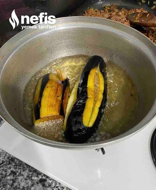 - Patlıcanları alacalı soy, acısının çıkması için tuzlu suda 20–30 dakika beklet, sudan çıkarıp düzgünce heyete. Kızgın yağda patlıcanları hafif yumuşayana kadar kızart (çok kızartma, fırında da pişecek) Kızaran patlıcanları havlu kağıda al.