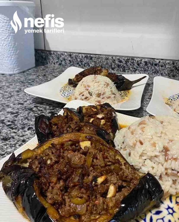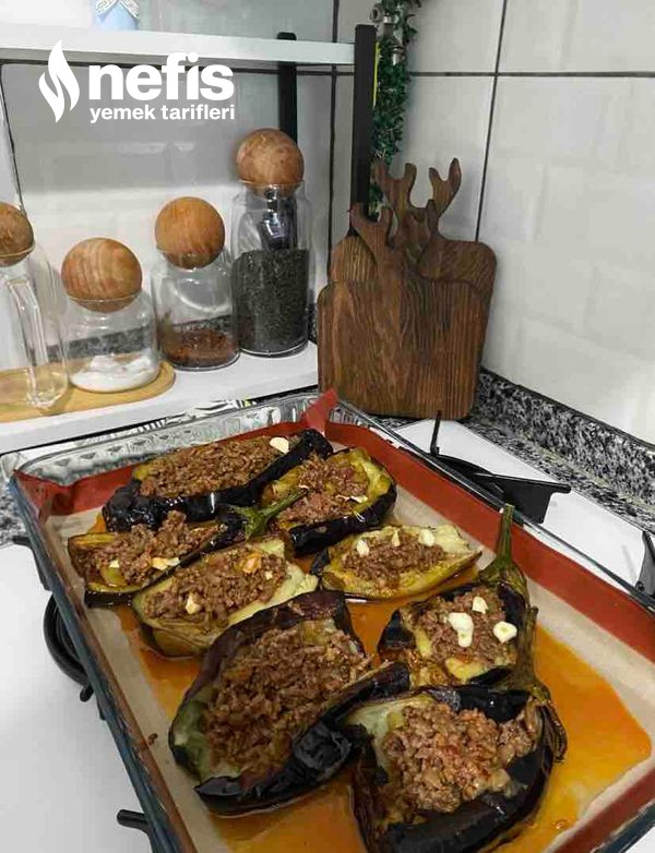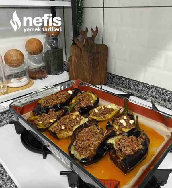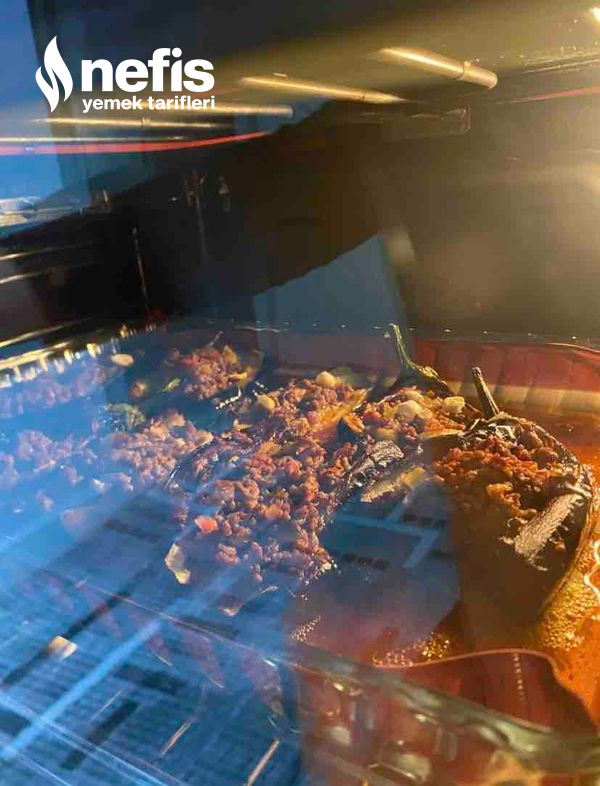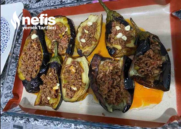 - Patlıcanların ortasını bıçakla uzunlamasına yar. İçini kaşıkla hafif aç. Hazırladığın kıymalı harcı patlıcanların içine doldur. Üzerine bir dilim domates ve bir modül biber koy.
